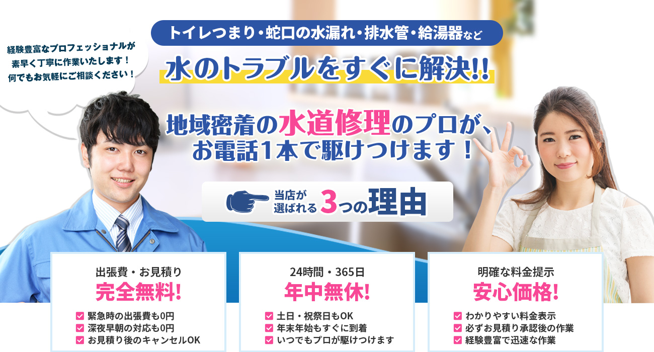 東京・埼玉・神奈川・千葉・茨城はお電話一本で担当者が到着!水漏れ・つまりなどお任せください。
